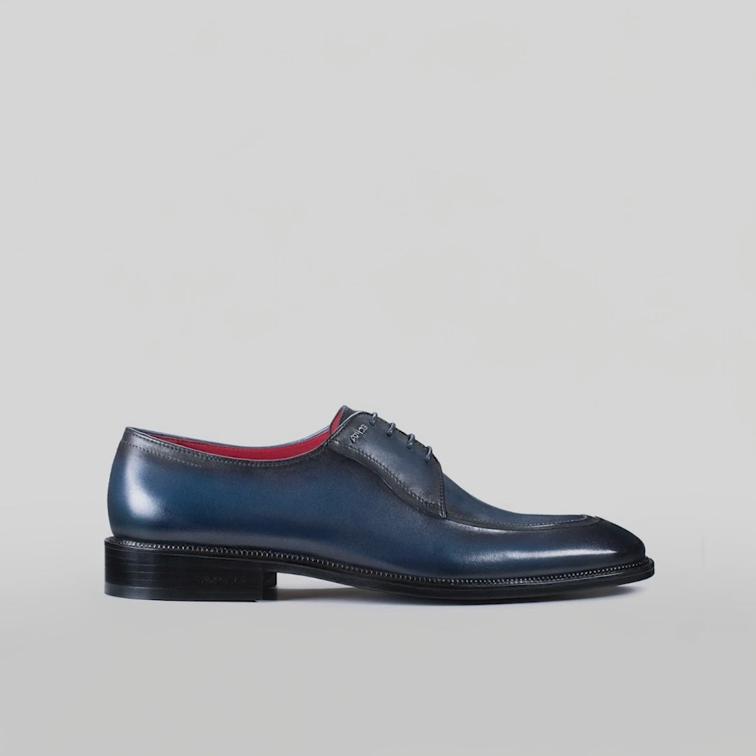 These men’s navy blue leather Derby shoes unite classic style and modern character. The surface is made of smooth calf leather, with a hand-applied patina to produce a rich appearance of tones, darker at the edges, changing to black. The almond-shaped toe and the five-eyelet lace-up fastening provide the traditional style. The calf leather lining and insole are soft and comfortable inside, making them easy to wear throughout the day. The complete leather sole makes it durable and clean with each step. Subtle details like the Armos logo embossed on the side and sole, focus on the handicraft behind the pair. Unique in their own way, these men’s navy blue leather Derbies are a perfect option when it comes to custom suits or casual evening wear.