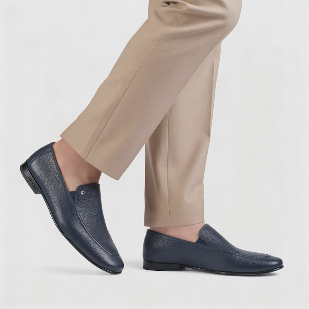 For the man who appreciates refined luxury without being too ostentatious, this navy blue leather loafer is a perfect choice to add texture and richness to any collection. The upper features deer leather with a pebbled texture that catches the light exquisitely, while the rich navy coloring takes a subtle and sophisticated approach to the otherwise neutral palette. The leather lining and insole make for a comfortable and breathable wear experience throughout even the longest of days. The almond-shaped toe provides a nice tapering for the foot while the Armos embossing accents the heel and front tab as a branded touch. Finished with a leather sole, these men's navy blue leather loafers maintain a simplistic approach to styling with hints of heritage. These navy loafers should be styled with custom-fit trousers for a daytime look proper for business suiting, or with dark jeans and a light linen blazer for an easy transition into evening effortless style.